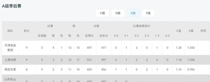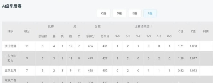 1、浙江德清取得4场得手、1场失利,共积11分2、广东台山和力取得3场得手、2场失利,累计得回9分3、北京北汽取得2场得手、3场失利,共积7分4、南京广电猫猫取得1场得手、4场失利,共积3分