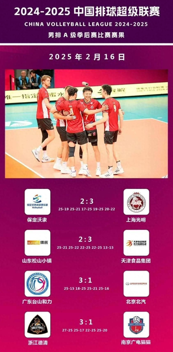 2024 - 2025赛季中国男人排球超等联赛A级季后赛第二十三轮赛事沿途赛毕。保定沃隶在主场以2 - 3的比分惜败于上海光明;山东松山小镇主场作战,相同以2 - 3的比分负于天津食物集团;广东台山和力在主场以3 - 1的比分打溃逃京北汽;浙江德清主场3 - 1顺服南京广电猫猫。此轮比赛事后,天津男排卓越上海男排,升至积分榜首位体育集锦,同期,赛后的积分排行情况、单项最好以及累计最好本领统计成果均已公布。