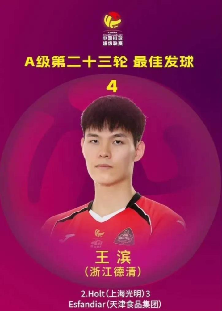 最好发球:浙江德清的王滨4在2024 - 2025赛季中国男排超等联赛A级季后赛第二阶段F组5 - 8名排位赛的第二十三轮赛事中,浙江德清男排镇守主场,以3 - 1(27 - 25、25 - 17、22 - 25、25 - 20)的比分打败江苏南京广电猫猫男排。浙江德清队的王滨凭借3个发球得分,荣膺本轮最好发球手。