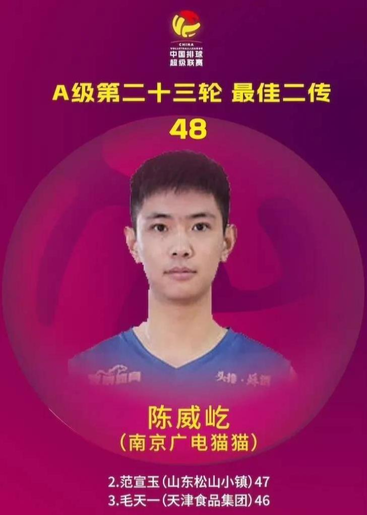 最好二传: 陈威屹(南京广电猫猫)48在2024 - 2025赛季中国男排超等联赛A级季后赛第二阶段F组5 - 8名排位赛的第二十三轮赛事中,浙江德清男排在主场以3 - 1(27 - 25、25 - 17、22 - 25、25 - 20)的比分打败了江苏南京广电猫猫男排。此轮比赛里,江苏南京广电猫猫男排的二传陈威屹凭借48次有用传球,荣获最好二传手称呼 。