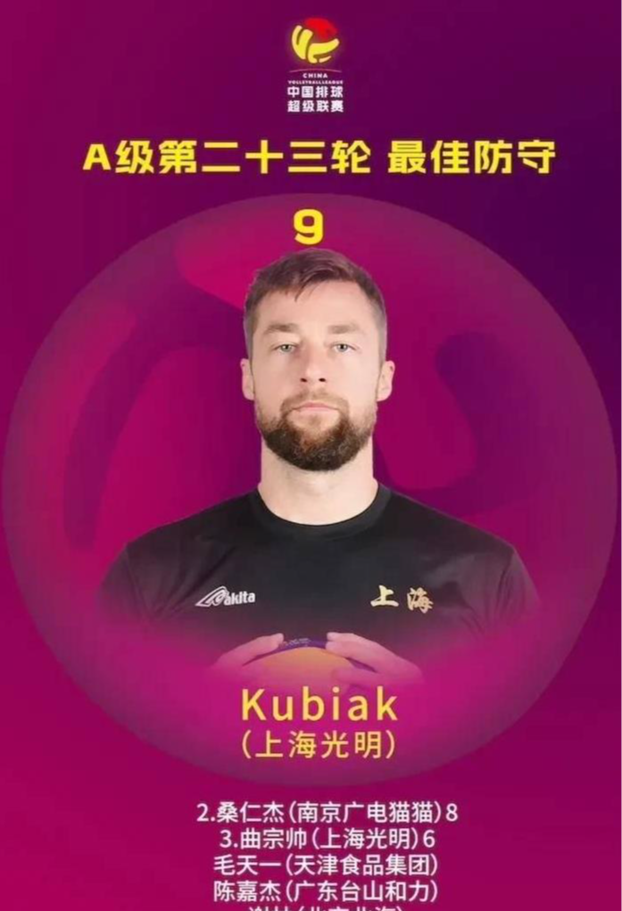 最好驻守: Kubiak(上海光明)9在2024 - 2025中国男人排球超等联赛A级季后赛第二十三轮赛事中,客场作战的上海光明男排以3比2的比分打败了保定沃隶男排。这场比赛历经五局,各局比分纪律为19比25、21比25、25比17、25比19以及22比20 。此役体育集锦,上海光明男排的外助Kubiak凭借9次有用驻守,荣获该轮最好驻守球员称呼。适度第二十三轮,男排A级赛事累计的最好单项本领具体情形如下:最高得分:Padar(上海光明)449最好扣球得益由张冠华(浙江德清)创造,达到391 。最好发球:Esfandiar(天津食物集团)55(此句由于信息浮松且表意明确,可变动空间有限,基本保留原文结构和施行 )最好拦网方面,来自浙江德清的李咏臻得益为84最好二传手:刘泽(北京北汽)872最好一传包摄杨一鸣(浙江德清),其得益为260最好驻守东谈主选为来自浙江德清的杨一鸣,得益是146 。