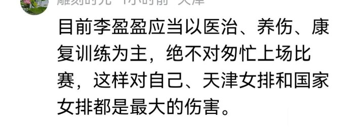 也有的球迷一又友说:“目下李盈盈应当以医治、养伤、康复测验为主,完全不仓卒中上场比赛,这么对我方、天津女排和国度女排齐是最大的伤害”。